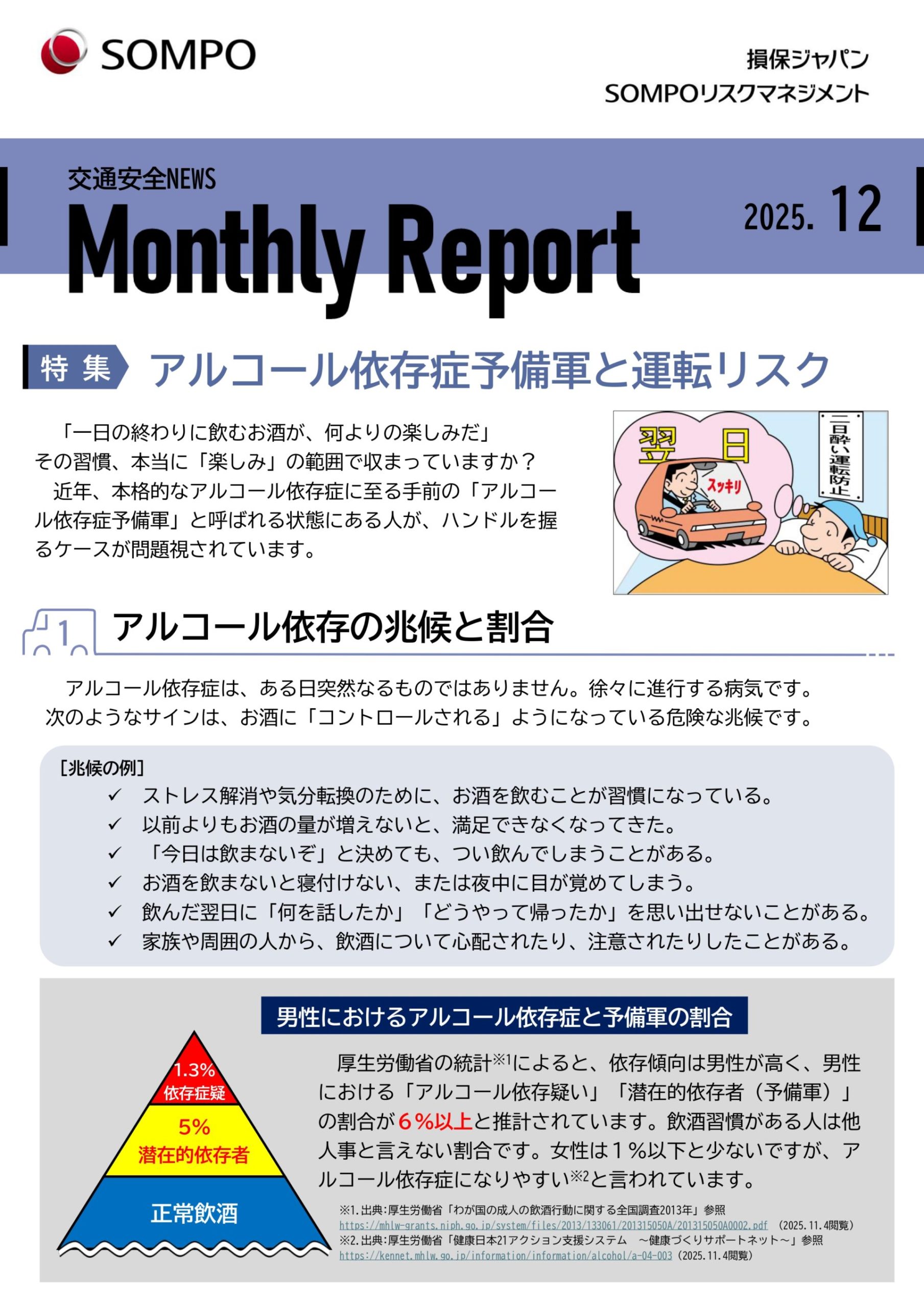 今月の「安全運転 NEWS マンスリーレポート」では、「アルコール依存症予備軍と運転リスク」 をテーマに取り上げています。